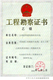 国家乙级工程地质勘察资质; 证书编号 263073--KY